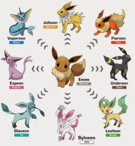 Eevee kan in heel veel verschillende vormen evolueren. Wat grappig is, ze eindigen allemaal op eon. Voor sommige heb je een steen nodig. Voor Flareon een vuursteen, voor Jolteon een dondersteen en voor Vaporeon een watersteen. Terwijl je voor anderen juist in de buurt van een grote rots een level omhoog moet gaan. Dit geldt voor Glaceon bij de ijsrots en Leafeon bij de mosrots. Umbreon moet in de nacht een level omhoog gaan en Espeon overdag. En dan tot slot Sylveon, die moet een hechte band met de trainer hebben.